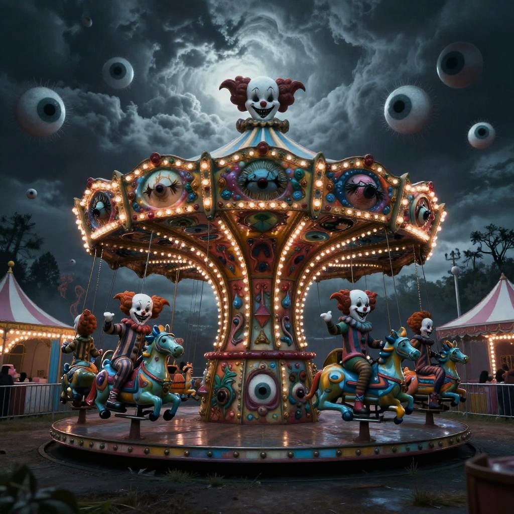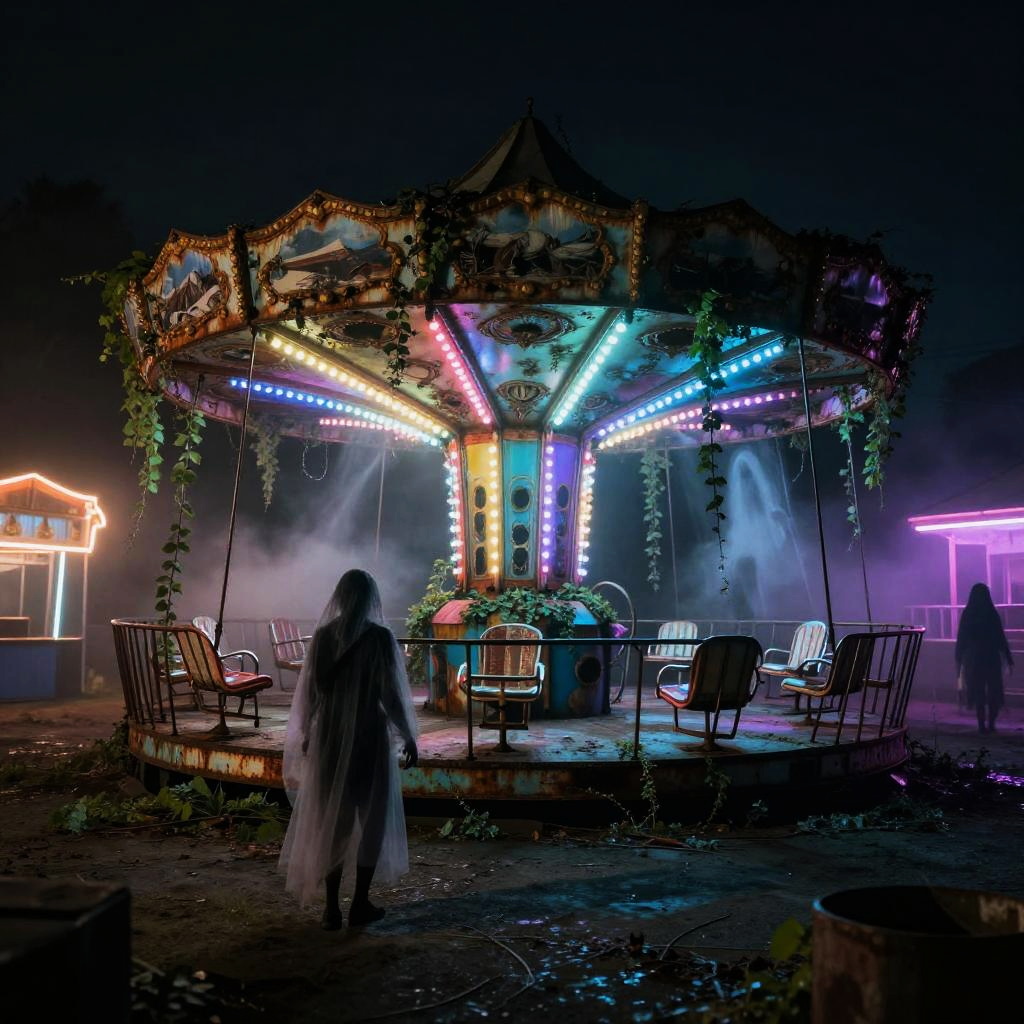 Creepy uncanny images of a forgotten carnival at night, rusted rides overgrown with vines, ghostly silhouettes wandering in the fog, flickering neon lights casting sinister shadows, unsettling juxtaposition of decay and vivid flashes of unnatural colors.
