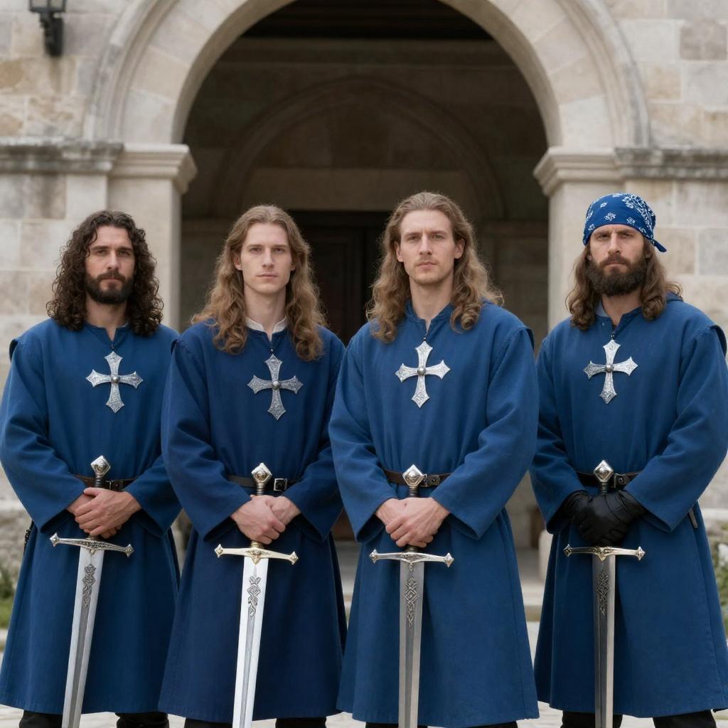 Four men dressed in blue medieval-style robes adorned with large silver crosses stand in front of a stone building with an arched entrance. Each holds a decorated white sword with ornate hilts. The men have long hair and beards; one wears a blue bandana and black gloves. They have serious expressions, evoking a historical or fantasy theme.