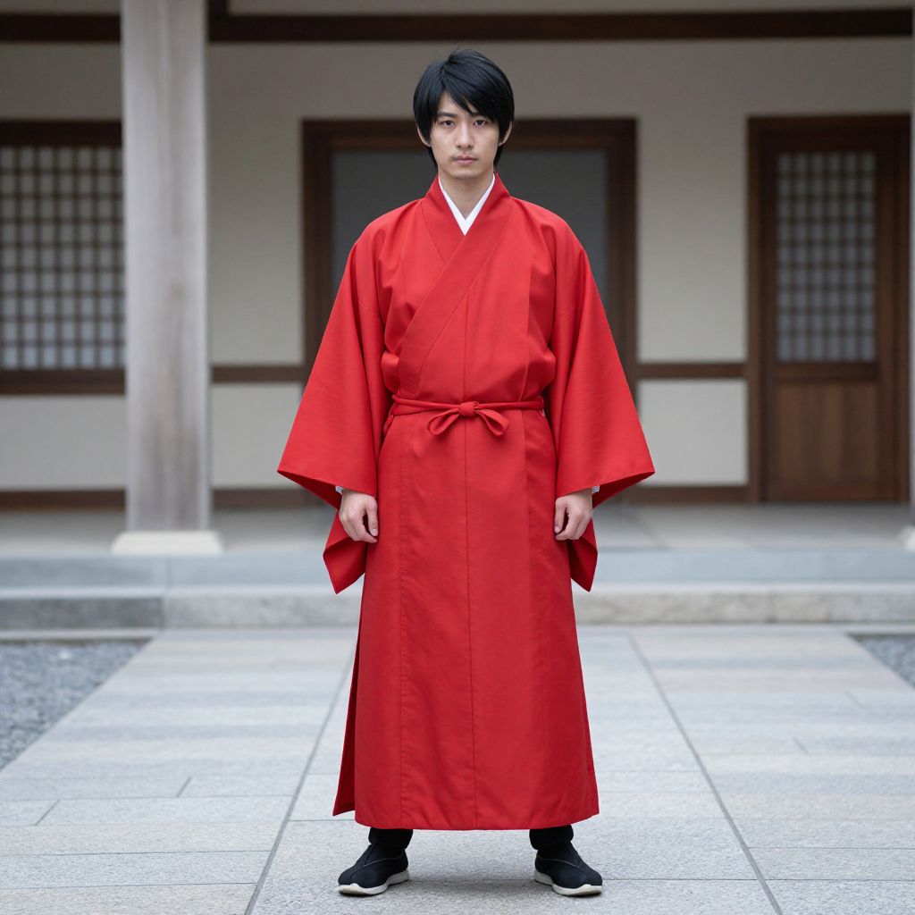 Photograph of a young East Asian man with black hair, wearing a bright red traditional kimono and black shoes, standing in a traditional Japanese courtyard with