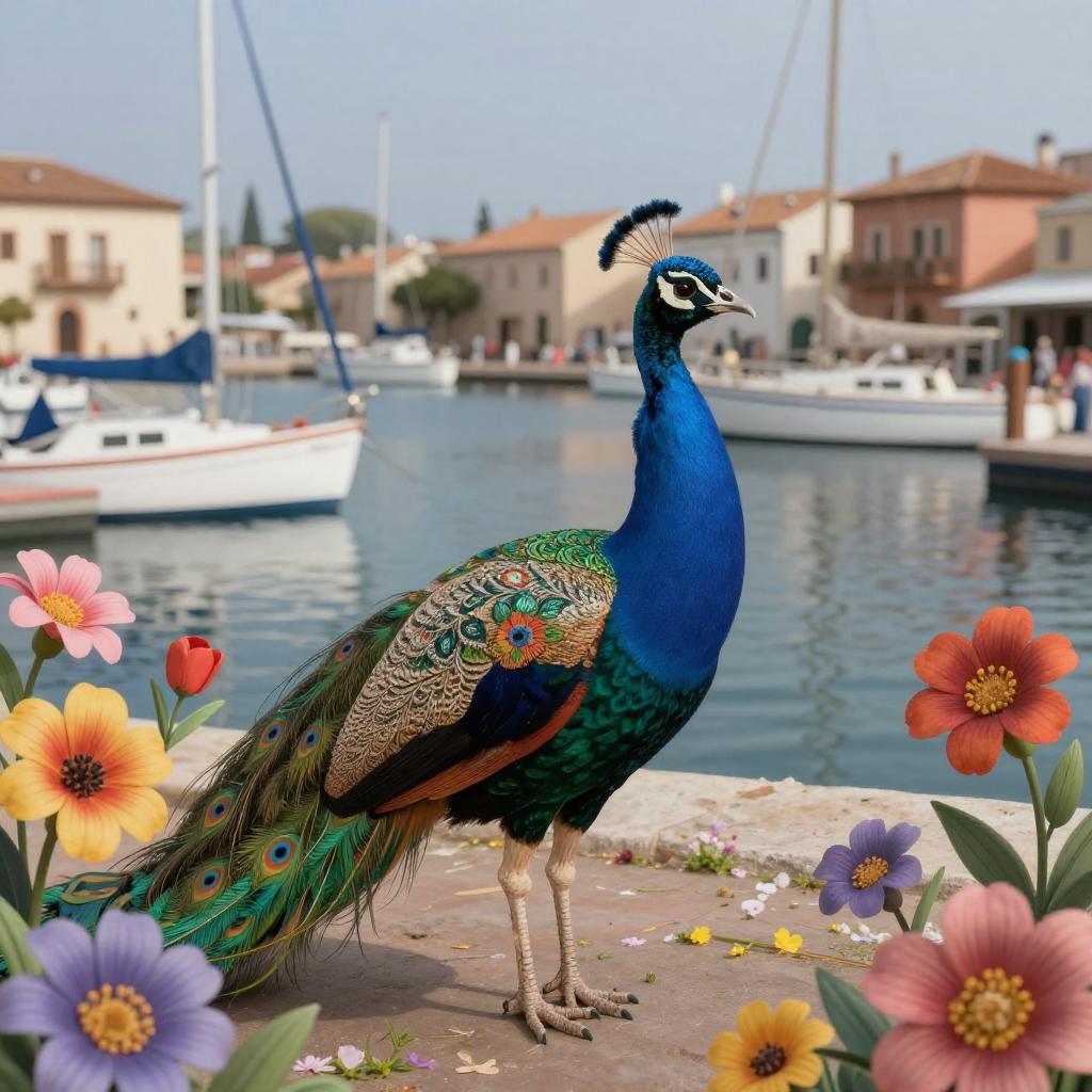 A hyper-detailed illustration of a majestic peacock standing by a vibrant marina, framed by an array of whimsical and colorful flowers. Crafted in the artistic style inspired by Frida Kahlo, the image features intricate floral patterns and a soft, diffused lighting that creates an enchanting and lively atmosphere. The background shows a calm marina with boats and buildings, blending natural beauty with cultural elements.