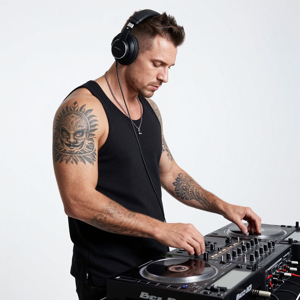 A muscular man with tattoos and headphones, wearing a CDJ equipment console, stands in a high-fidelity, photorealistic image with a plain white background.