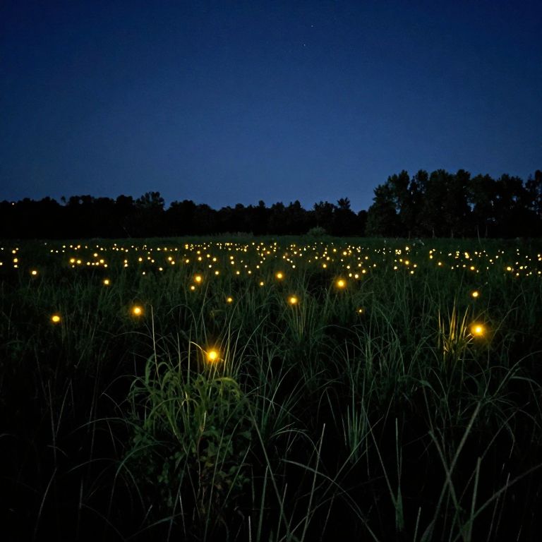 Fireflies illuminate a serene nocturnal field with golden orbs scattered among tall grasses, while distant trees and a starry sky frame the tranquil scene.