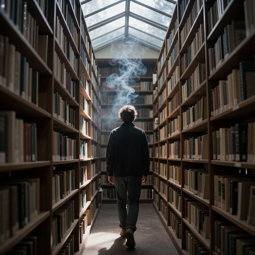 Photograph of a man with short, curly hair, standing with his back to the camera, walking down a narrow library aisle. He wears a black jacket and blue jeans. Tall, wooden bookshelves filled with books line both sides, creating a tunnel effect. Light from a glass-paneled roof above casts dramatic shadows, illuminating the man's figure and trailing a wisp of blue-gray smoke from his jacket. The floor is dark, and the overall atmosphere is moody and introspective.