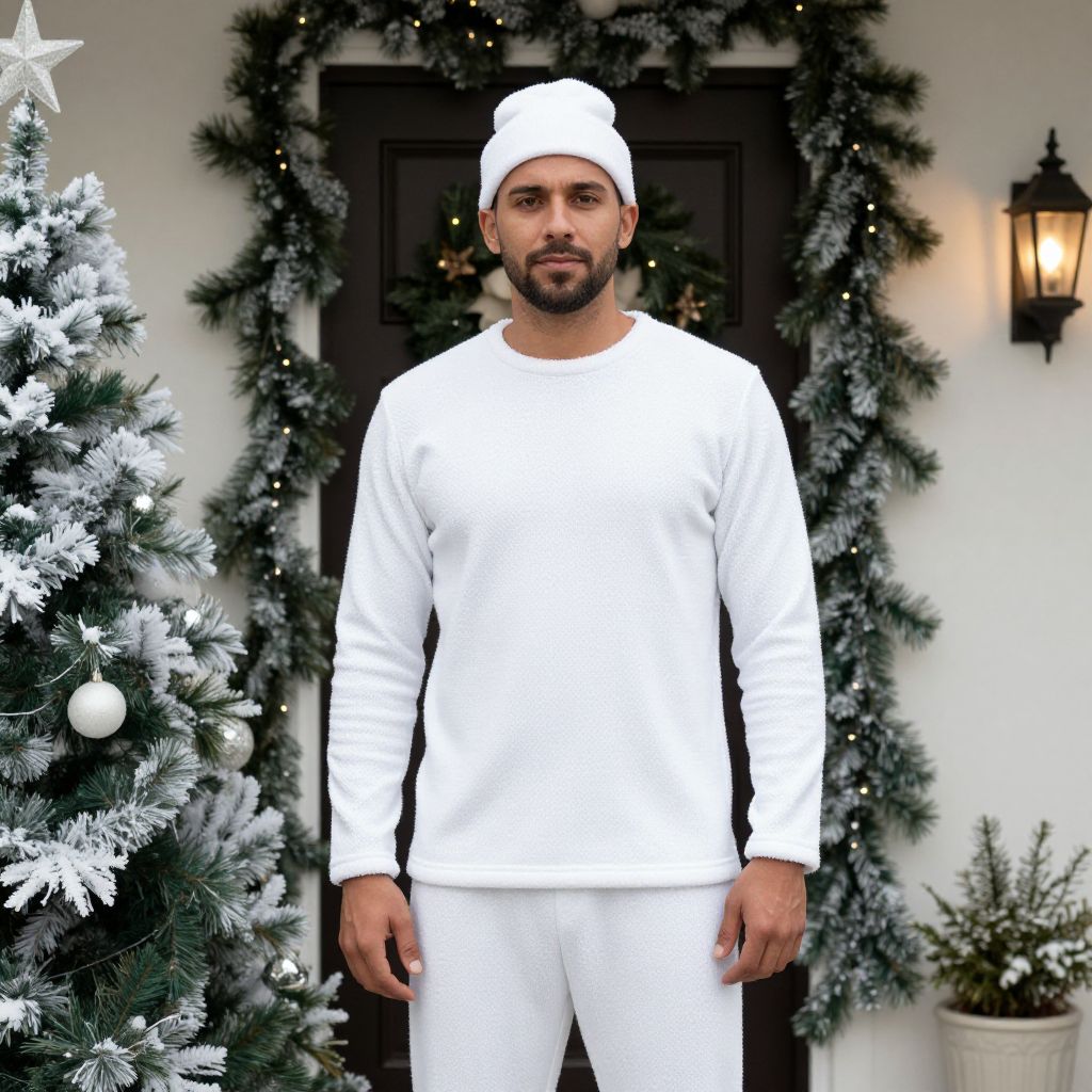 White Christmas Inspired Outfit Costume, man standing in front of a door with christmas decorations