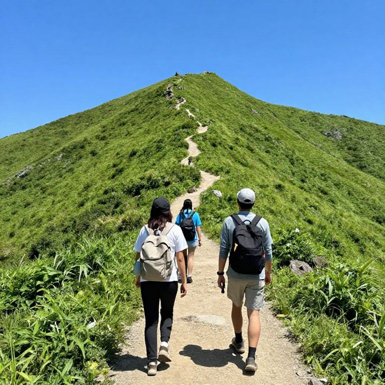 Photograph of three hikers ascending a steep, grassy hill on a narrow, dirt path. The hikers, one female with long black hair in a white shirt and black pants, and two males in blue and gray shirts with backpacks and hats, are seen from behind. The hill is lush green with a clear blue sky overhead. The path winds upward, disappearing at the hill's summit. The hikers' shadows are cast on the path, adding depth to the image.