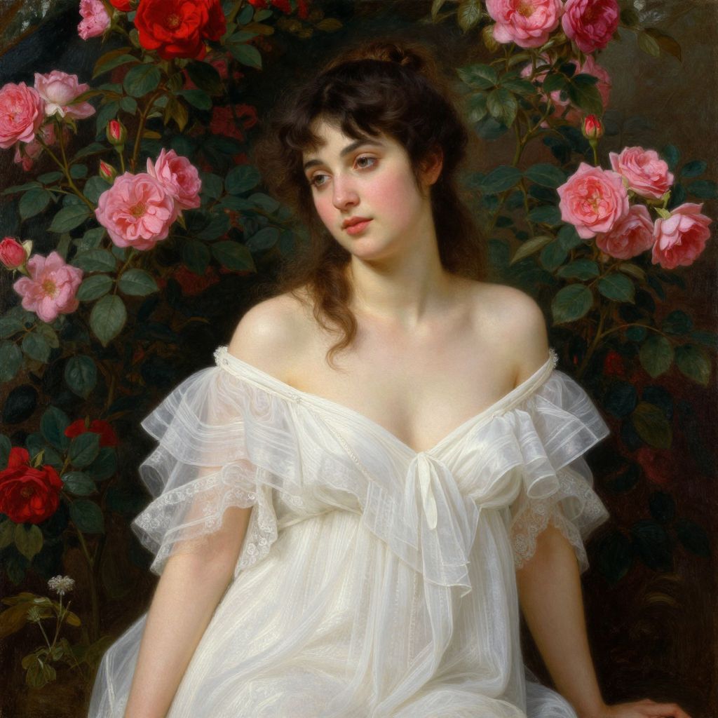 This is a digital painting of a fair-skinned young woman with dark, wavy hair, wearing an off-the-shoulder, white, lace-trimmed dress with a bow at the chest. She has a slight, contemplative expression and pink blush on her cheeks. She stands against a dark background filled with vibrant pink and red roses with green leaves. The painting style is realistic with a romantic, Victorian influence, focusing on soft lighting and delicate textures. The woman's dress is slightly sheer, adding a sense of elegance and delicacy to the image.