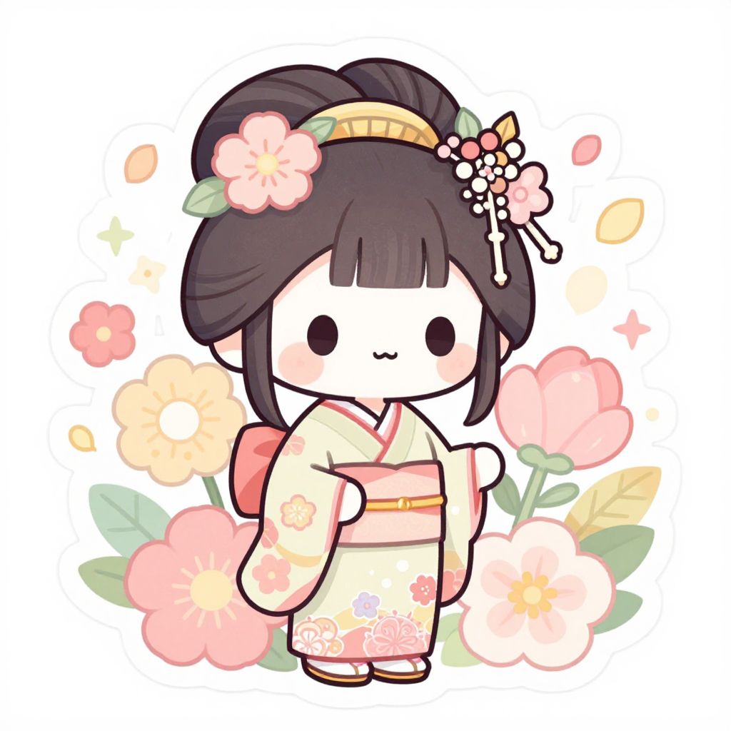 Chibi-style drawing of a cute, smiling girl in a pink floral kimono with a traditional Japanese hair accessory, surrounded by pastel flowers.
