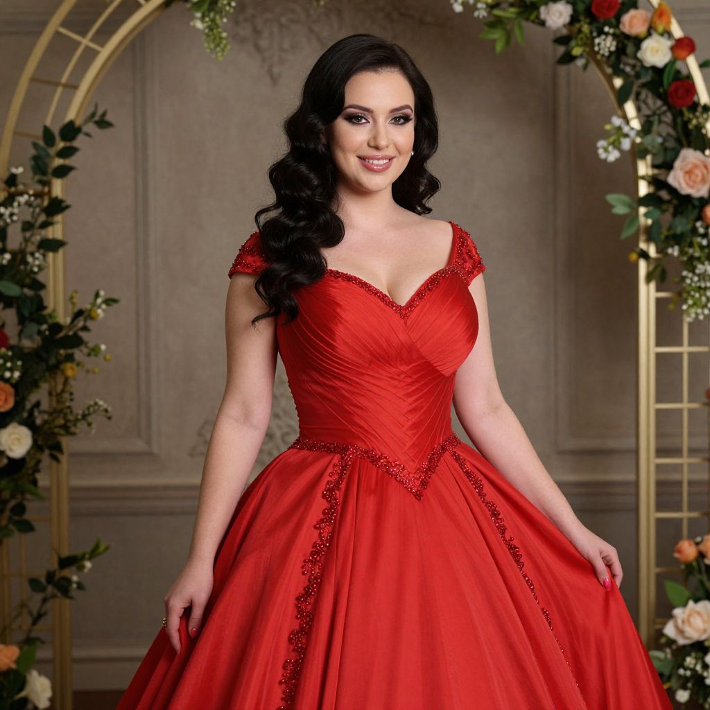 A realistic photograph of a stunning woman with dark wavy hair and a gentle, glowing smile wearing a magnificent red wedding dress with a full skirt and beaded trim, posed under a vintage-inspired wedding arch with floral decorations. The woman has big tits and cute face