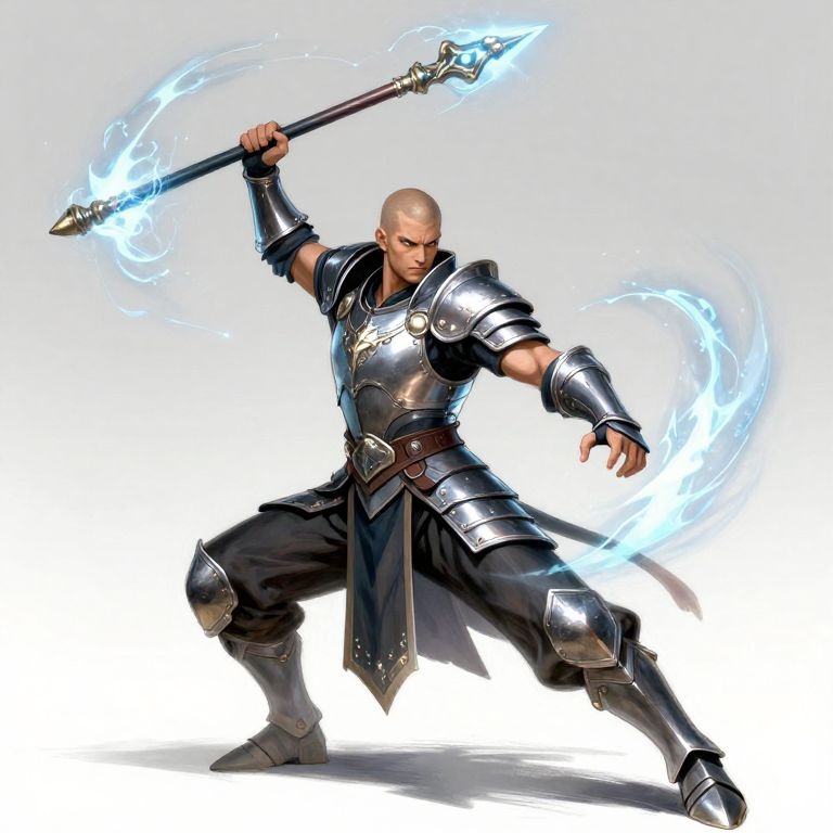 Digital illustration of a muscular bald man in silver armor wielding a glowing blue magical staff. He is in a dynamic, wide-legged stance, with his right arm raised and left arm extended. Blue energy swirls around his staff, adding a magical aura. His armor has intricate designs and a dark, flowing cape. The background is a simple gradient from white to light blue, emphasizing his powerful pose and the glowing staff. The art style is highly detailed and dynamic, with a focus on action and fantasy elements.