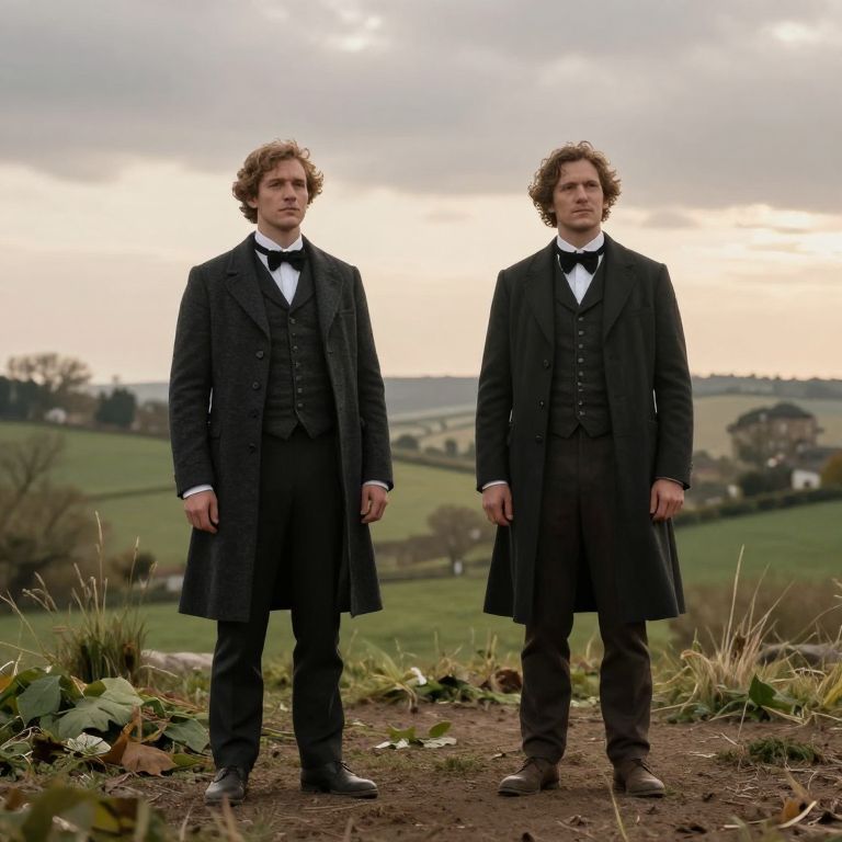 In the quiet tension of a pastoral backdrop, two figures stand poised on the cusp of change, their formal attire a testament to the weight of history and the promise of a new dawn, as the air carries whispers of freedom and the earthy scent of hope.