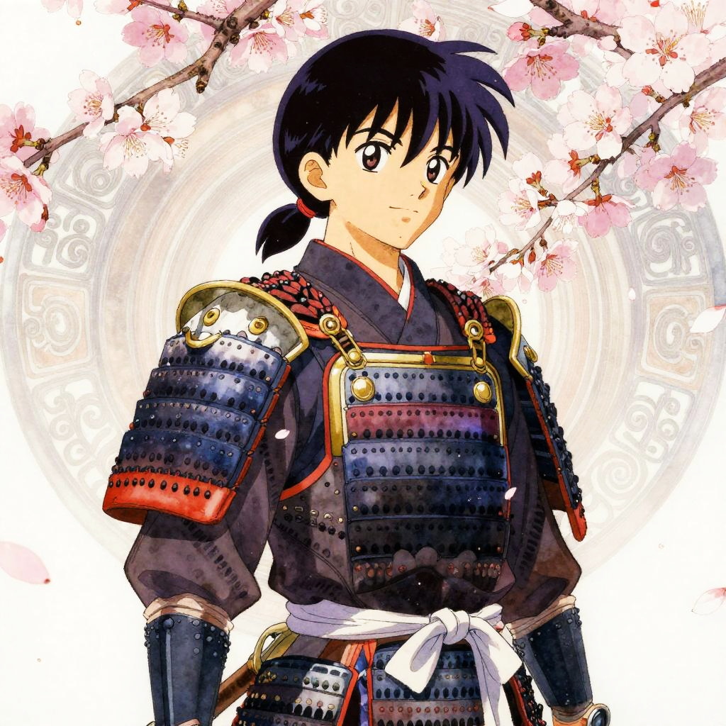 Animeboy wearing traditional samurai armor, cherry blossom petals falling around him, serene expression, watercolor anime style, intricate background