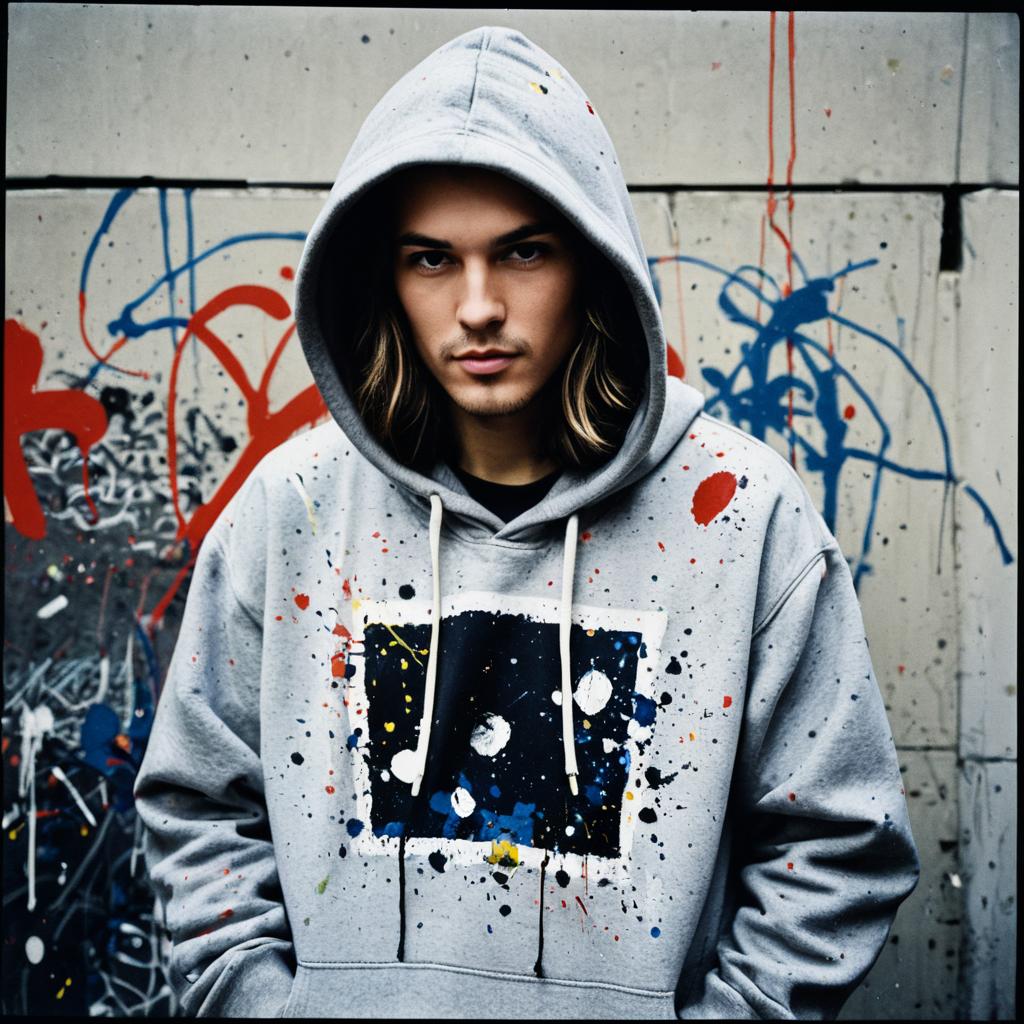 Portrait of an urban street artist, shot by Steven Meisel and Mario Testino, featuring a casual oversized hoodie with paint splatters, intricate texture, perfect details, film grain, analog photograph, shot on Phase One camera.
