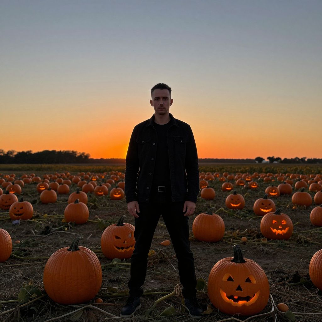 Photograph of a man standing in a vast pumpkin field at sunset. He's wearing an all-black outfit, looking directly at the camera with a serious expression. The field is filled with numerous orange pumpkins, some with carved, glowing jack-o'-lantern faces. The sky is a gradient of orange and blue, and the horizon is lined with distant trees. The overall scene has a spooky, autumnal vibe.