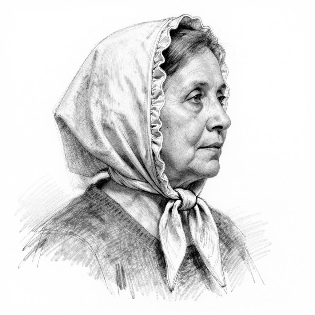 This black-and-white pencil drawing depicts a middle-aged woman in a three-quarter profile view. She has a stern expression and wears a headscarf with ruffled edges, tied under her chin with a bow. Her garment, likely a dress, is simple and textured, suggesting a traditional style. The artist uses detailed cross-hatching and shading to emphasize the woman's facial features, including her slightly furrowed brow and prominent cheekbones. The background is entirely white, making the subject stand out. The overall style is realistic, with a focus on texture and expression, capturing the woman's dignified and serious demeanor.