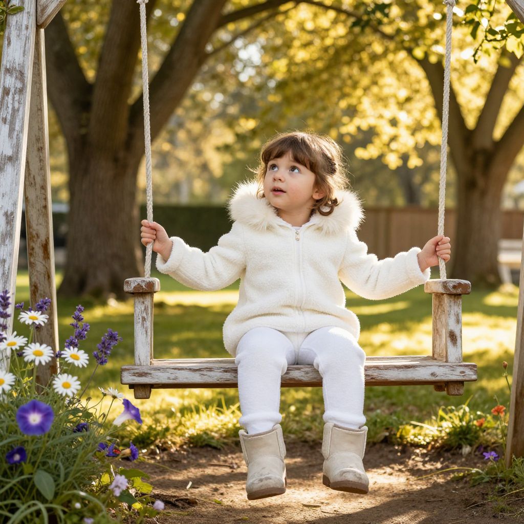 A small child, around 4 years old, with soft brown hair tied in a loose braid and large, wide, curious eyes, is wearing a cozy white outfit featuring a plush, fur-lined hood and sturdy, slightly scuffed boots, sitting on a weathered wooden porch swing in a sunny backyard. The golden sunlight filters through the tall, leafy trees, casting dappled patterns on the ground, while vibrant flowers—such as daisies, lavender, and morning glories—bloom in the foreground. The child is gazing up at the sky with wonder, their small hands gently resting on the swing's rail as the outfit gently sways with the breeze. The atmosphere is warm, peaceful, and whimsical, evoking a sense of childhood joy, nostalgia, and gentle magic, with soft shadows and natural textures enhancing the scene's realism and charm.