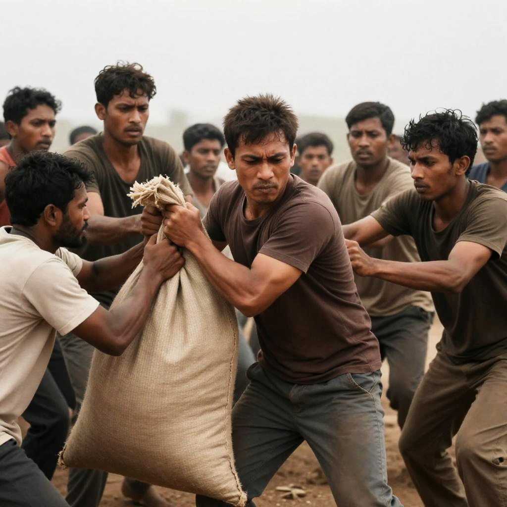 Photograph of a chaotic crowd. Central male figure with brown shirt and gray pants, muscles tensed, forcefully pushing large sack. Surrounding people, diverse, push and pull. Dusty, overcast sky background. Multiple facial expressions: determination, struggle. Crowded, dynamic scene.