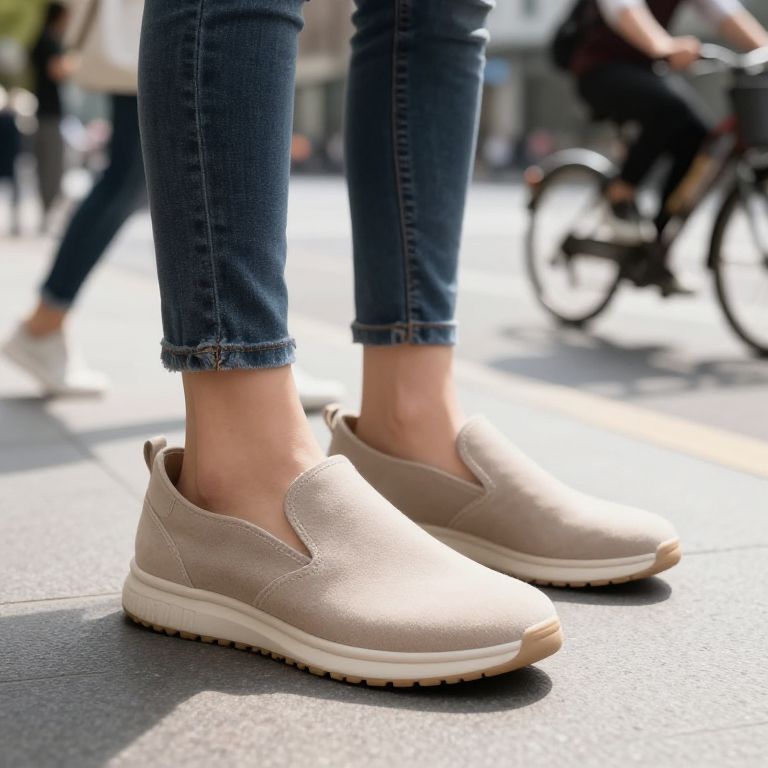 Comfortable street footwear in neutral tones, seen on a modern city street with people walking and cyclists passing, dynamic scene, realistic textures, detailed shadowing, Dall-E 3 style.