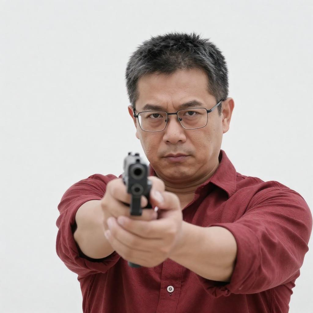 Photograph of a middle-aged man with short, dark hair and glasses, wearing a red, patterned shirt, pointing a black handgun directly at the camera. His expression is serious and focused. The background is a bright, overexposed white.