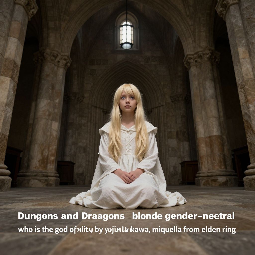 "Wide-Angle Interior Photography dungeons and dragons blonde gender-neutral child who is the god of purity by yoji shinkawa, miquella from elden ring,"