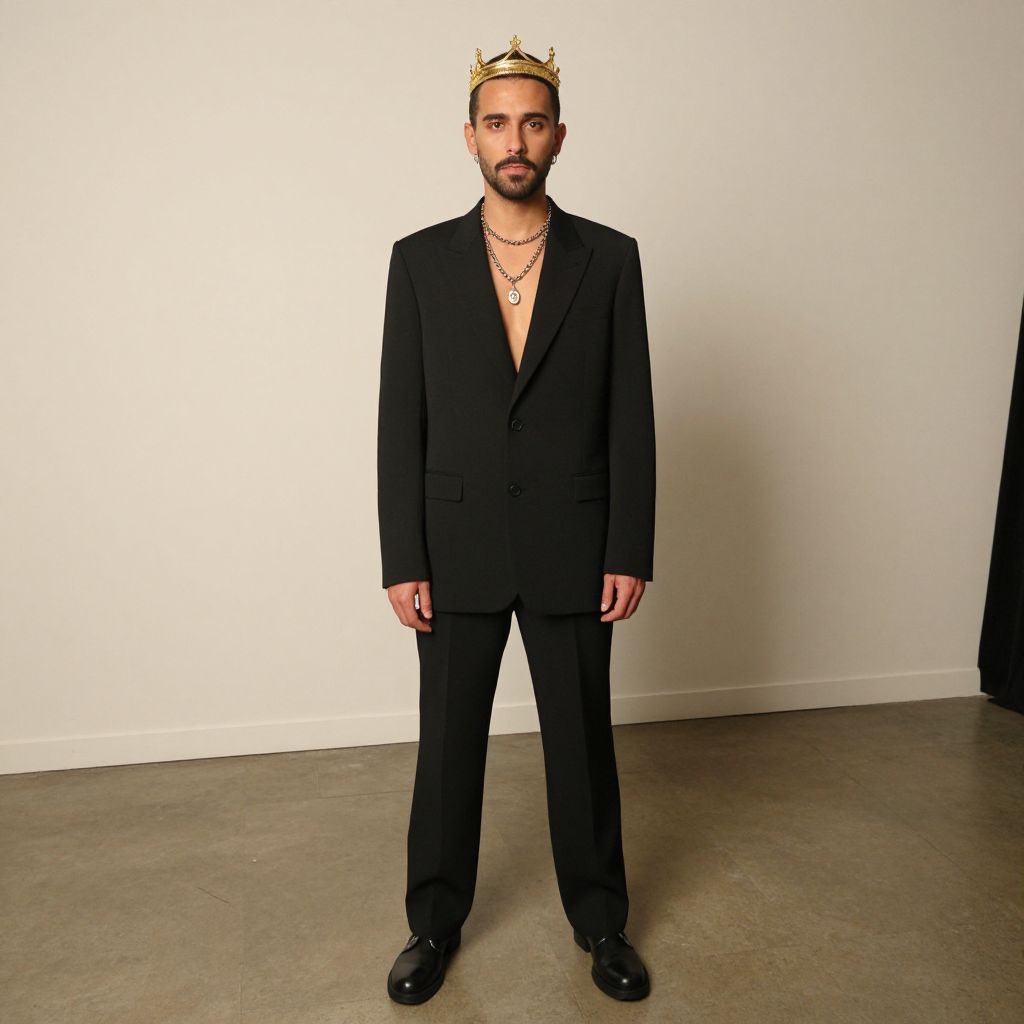 Photograph of a bearded man with a medium build, light brown skin, and short black hair, standing against a plain white wall. He wears a black suit with a deep V-neck, exposing a gold chain necklace. On his head, he has a small, simple gold crown. He also wears black dress shoes and another gold chain around his neck. The floor is concrete, and the lighting is even, casting soft shadows. The overall style is minimalist and slightly humorous due to the juxtaposition of the crown with the formal suit.