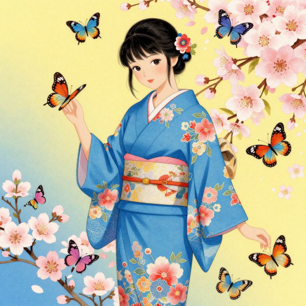 Digital illustration of a Japanese woman in a blue floral kimono, holding a butterfly, surrounded by colorful butterflies and cherry blossoms.