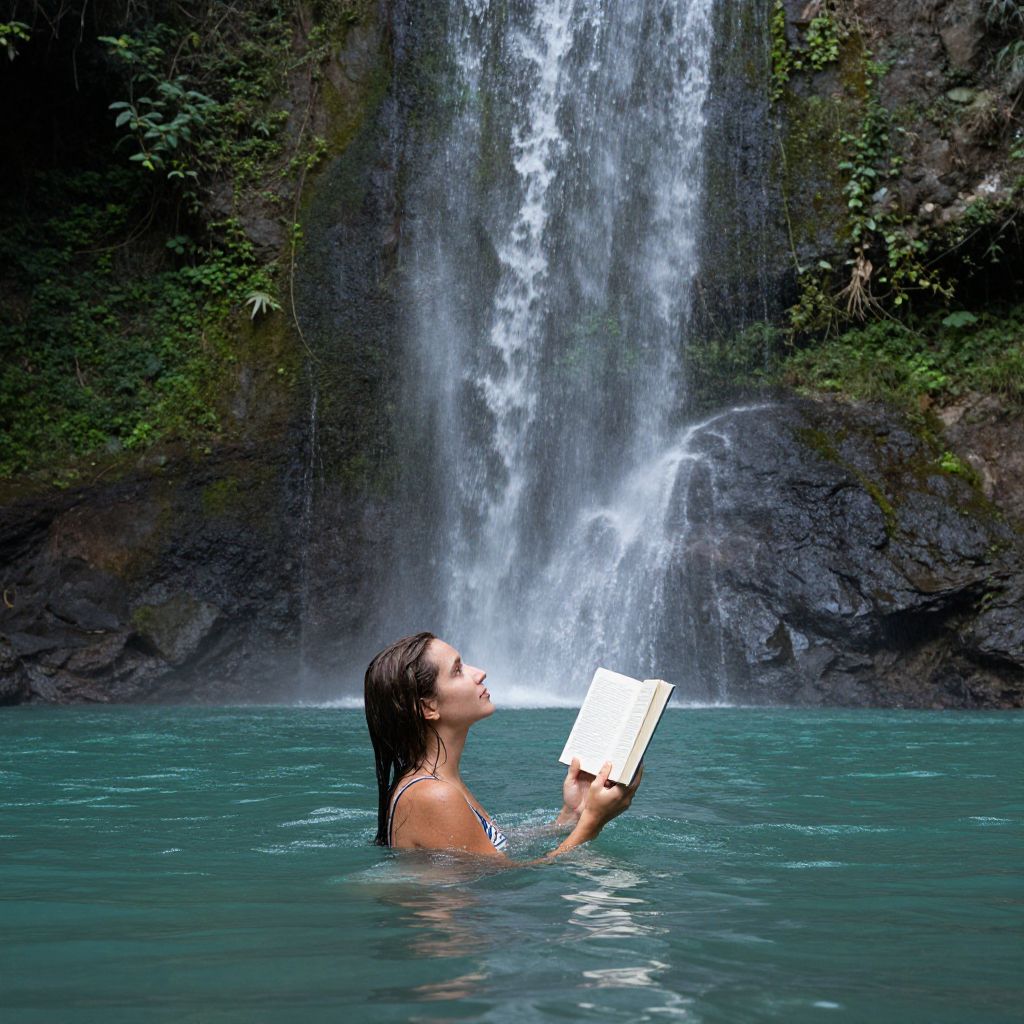 Photograph of a woman with wet, dark hair, holding a book, standing in turquoise pool, gazing at cascading waterfall.