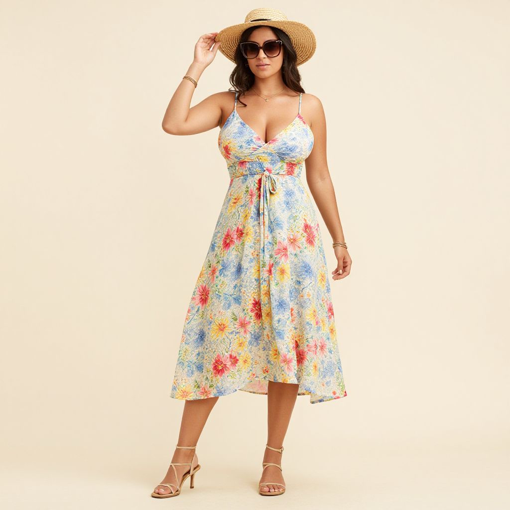 Photograph of a curvy woman in a floral sundress, straw hat, sunglasses, and strappy sandals, standing against a plain white background.