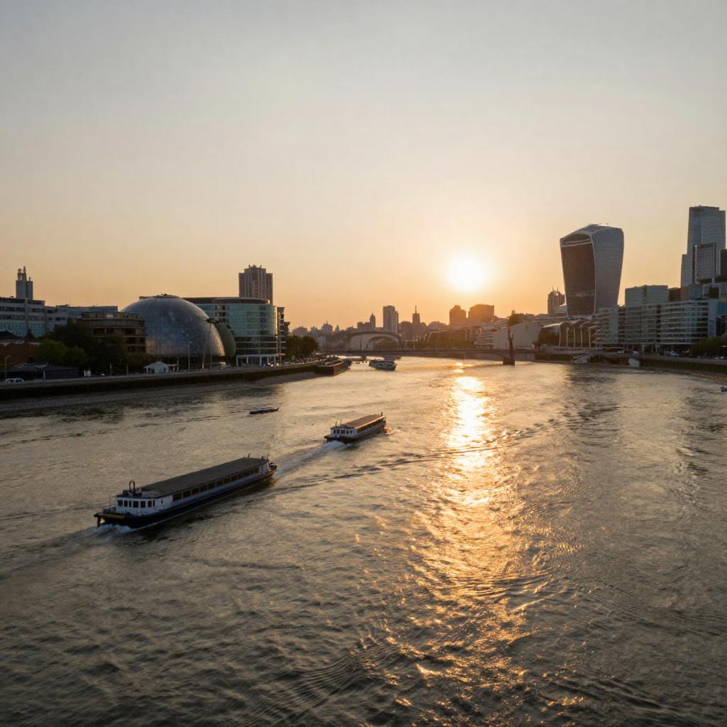 Photograph of a river at sunset, taken from a high angle. The warm golden light from the setting sun reflects off the water, creating a serene atmosphere. Several small boats float on the river. Modern buildings, including a distinctive dome-shaped structure, line the left bank, while a cityscape with various skyscrapers is on the right. The background is in focus, capturing the urban setting. The camera has a shallow depth of field, slightly blurring the water's surface.