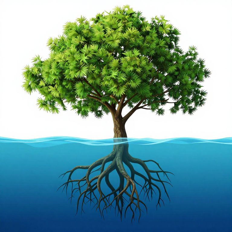 This digital illustration features a vibrant, green-leaved tree with a thick, brown trunk and intricate, sprawling roots extending downward into a clear, blue underwater scene. The tree's lush foliage is detailed with small, pointed leaves. The waterline is visible just below the trunk, dividing the image into two distinct sections: the upper portion of the tree, set against a stark white background, and the lower roots submerged in the blue water. The image combines realistic textures with a bright, cartoon-like style, emphasizing the contrast between the tree's greenery and the blue aquatic environment.