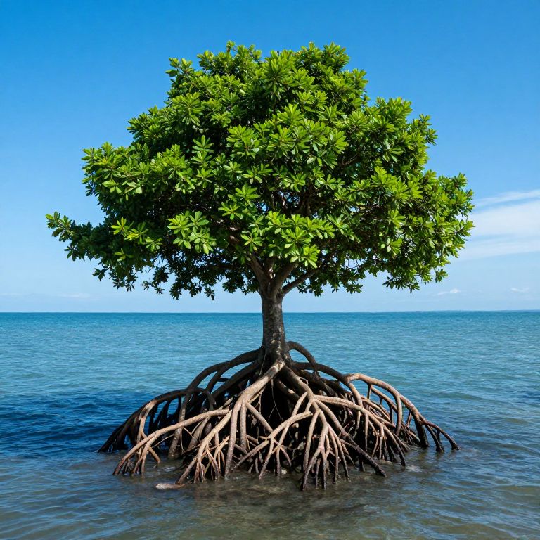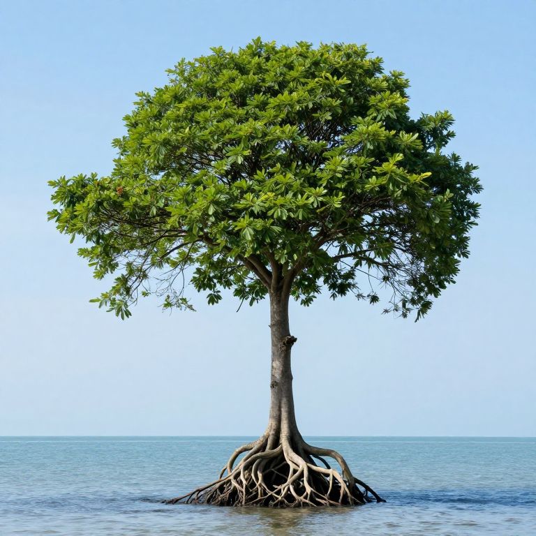 A digitally rendered, high-definition illustration depicts a solitary tree standing at the edge of the ocean, its vibrant green canopy swaying gently above the surface while its intricate root system extends deep into the clear blue waters below, symbolizing a harmonious blend of nature and the sea.