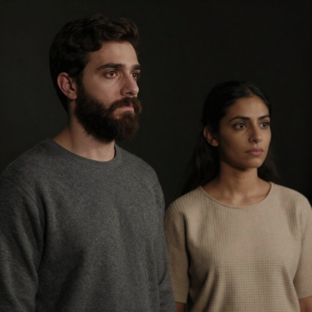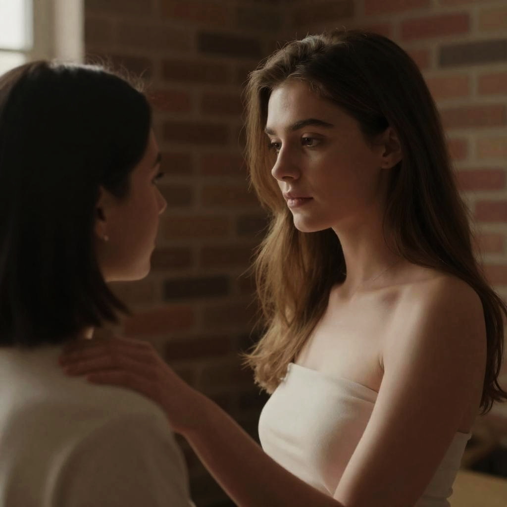 Photograph of three women. Central woman with pale skin, dark hair, serious expression, wearing dark top. Woman on right with tanned skin, dark hair, gold earrings, gently touching central woman's shoulder, focused expression. Woman on left in shadow, wearing red and gold headpiece, looking down. Dimly lit background.