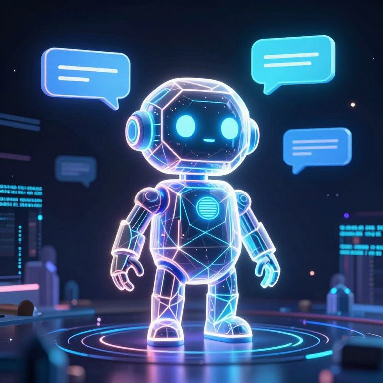 Neon-lit, glowing blue and white robot with large circular eyes, standing on a circular platform, surrounded by floating speech bubbles in a dark,