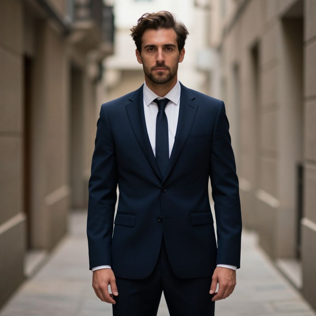 Photograph of a handsome, middle-aged man with dark brown hair and a trimmed beard, standing in a narrow, urban alleyway. He wears a well-fitted, dark navy blue suit with a white dress shirt and a black tie. His expression is serious and focused, with slightly furrowed brows. The background features blurred, beige-colored buildings on either side, creating a narrow corridor effect. The alleyway has a gray pavement, and the lighting suggests an overcast day, providing soft, diffused light. The overall style is modern and professional, with a focus on the man's confident, business-like appearance.