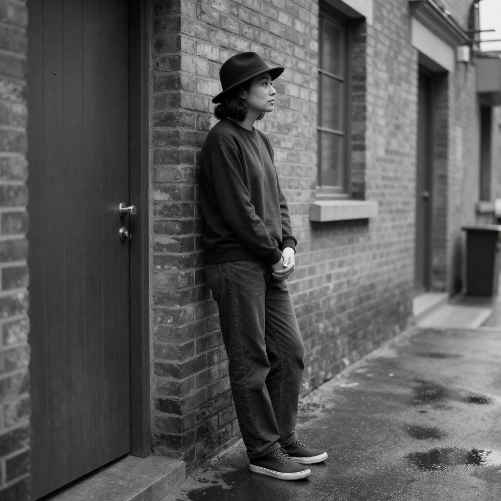 Black-and-white photograph of a person standing against a brick wall in an alleyway. The person, wearing a dark hat, long-sleeve shirt, and pants, looks to the right with hands clasped in front. The alley has a wooden door and brick buildings in the background. The ground is wet, reflecting light. The person's face is partially shadowed.