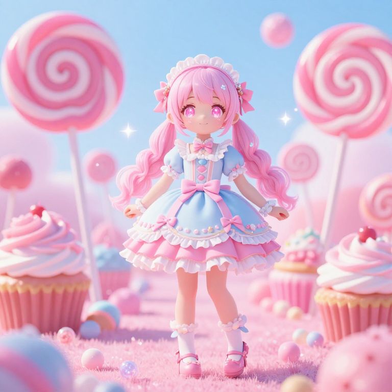 Loliy character in a dreamy candyland landscape, oversized lollipops and cupcakes around, pastel pink and blue color palette, whimsical and sweet atmosphere, detailed character design with sparkling eyes and frilly dress, magical light effects