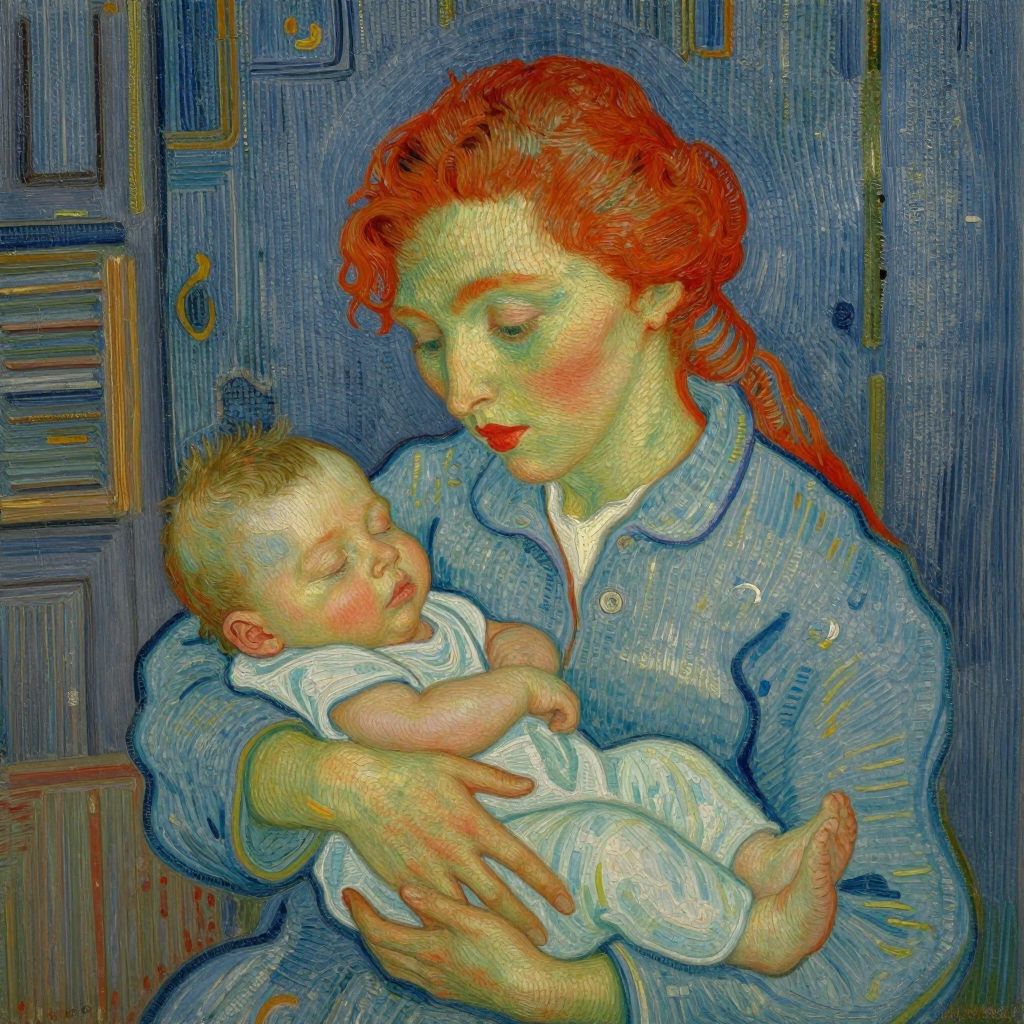 Vincent van Gogh-style painting of a red-haired woman with blue dress cradling a sleeping baby in white clothes against a dark blue, textured