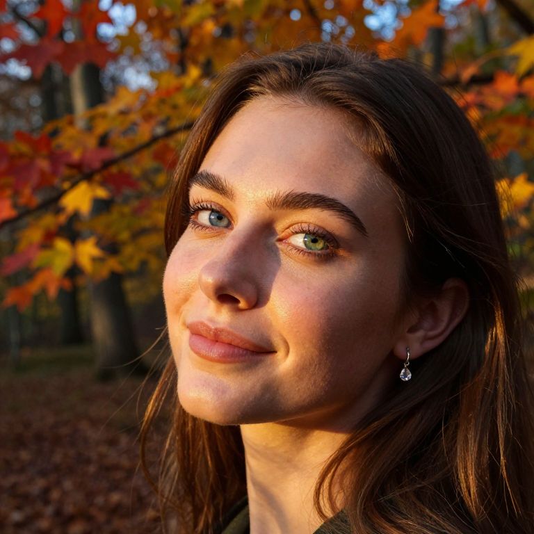 In a tranquil forest glade at twilight, sunlight filters through vibrant autumn foliage, casting dappled light on our subject's face. The portrait reveals hyper-realistic details and high-quality textures, showcasing an individual whose features tell tales of adventure and introspection. Their eyes, one blue and the other green, glisten beneath delicate eyelashes in the soft glow of the setting sun. A subtle smile graces their lips as they tilt their head slightly, showcasing an ear adorned with a small crystal earring that catches the light. The backdrop is filled with vibrant autumn hues and the distant rustling of leaves, creating a sense of serene harmony within this intimate portrait that captures both beauty and complexity in one captivating frame.
