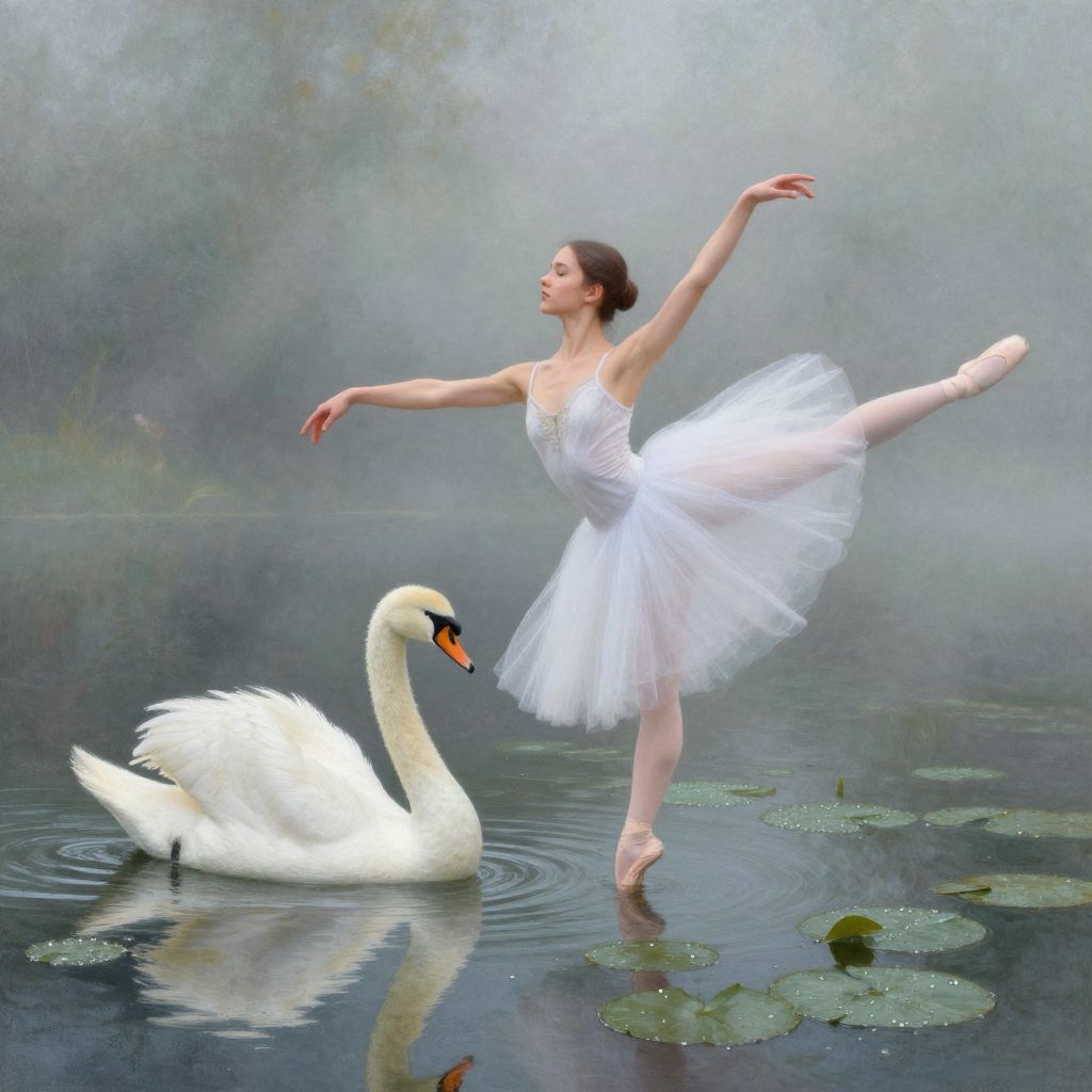 A graceful ballerina dances in harmony with an elegant swan amidst a tranquil, misty pond, evoking a sense of whimsy and poignancy. In the impressionistic style, soft brushstrokes blend colors to create a dreamlike atmosphere. The dancer's delicate tutu flutters gently as she pirouettes on dew-covered lily pads, with subtle shadows from the soft light enhancing her ethereal elegance. This captivating fusion of nature and artistry invites viewers to marvel at the timeless beauty of this enchanting performance.