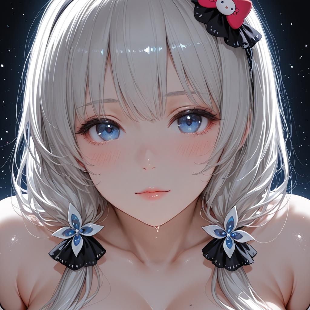 Digital illustration of an anime-style girl with long, silvery white hair adorned with black and white flower accessories. She has large purple eyes and wears a black and white outfit with a ribbon and blue brooch. The background features a starry purple sky and a small depiction of the Hello Kitty character peeking from the side.