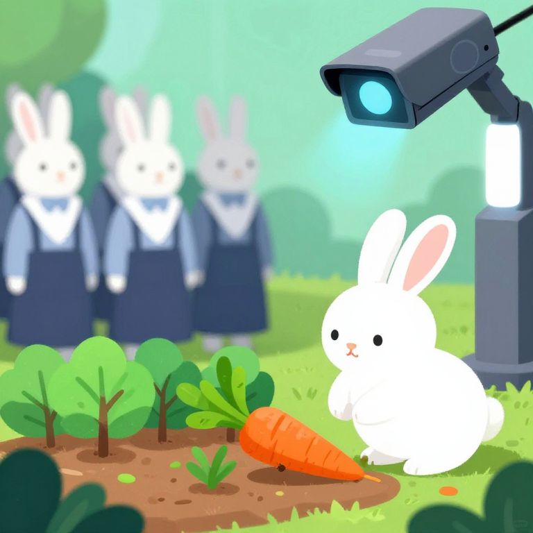 "Choir A picture of a bunny trying to steal a carrot from a garden but getting caught in a futuristic security system.,"
