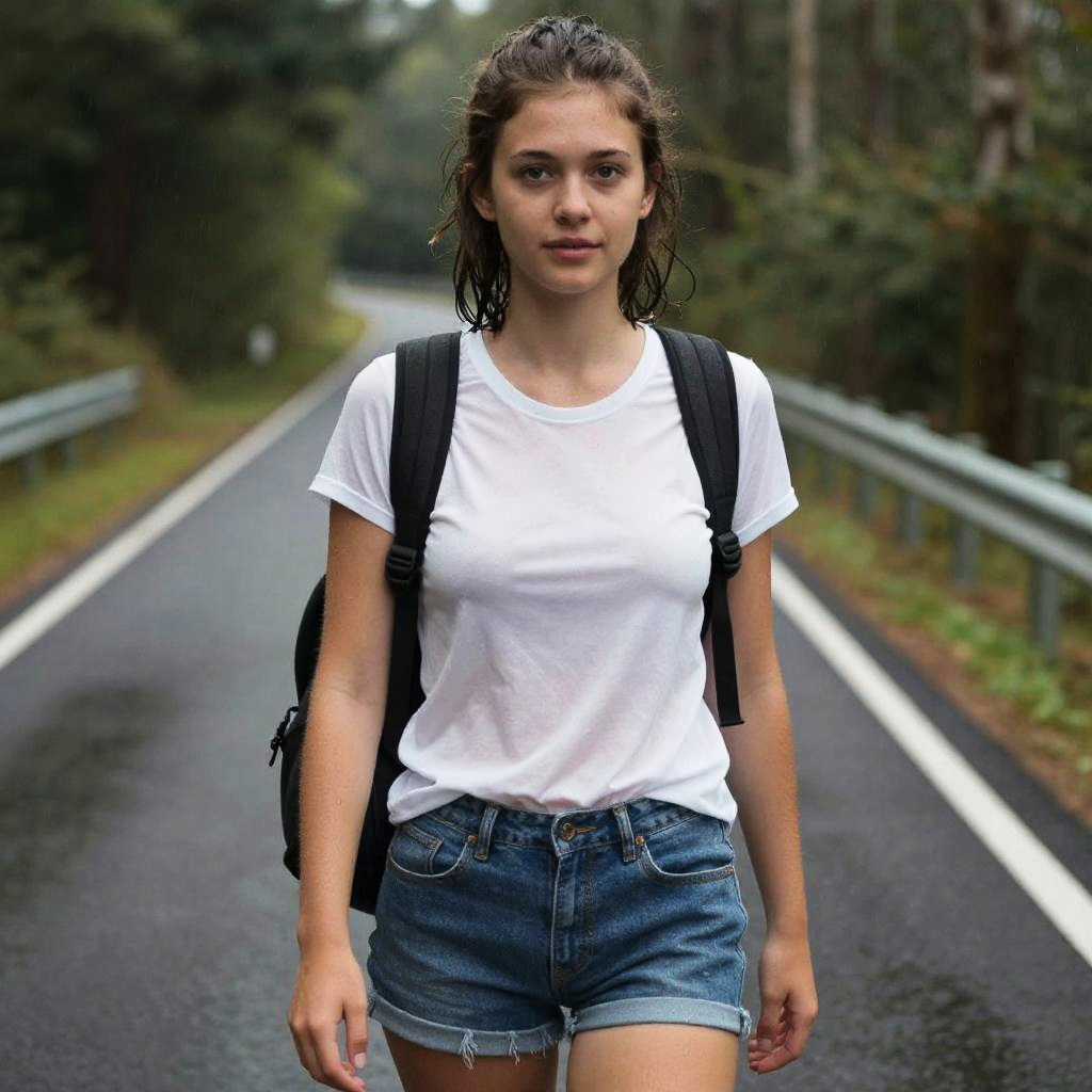 Anamr in mountain hiking trail, messy bun hair, extremely detailed, realistic, perfect skin), looking at viewer, standing, full body