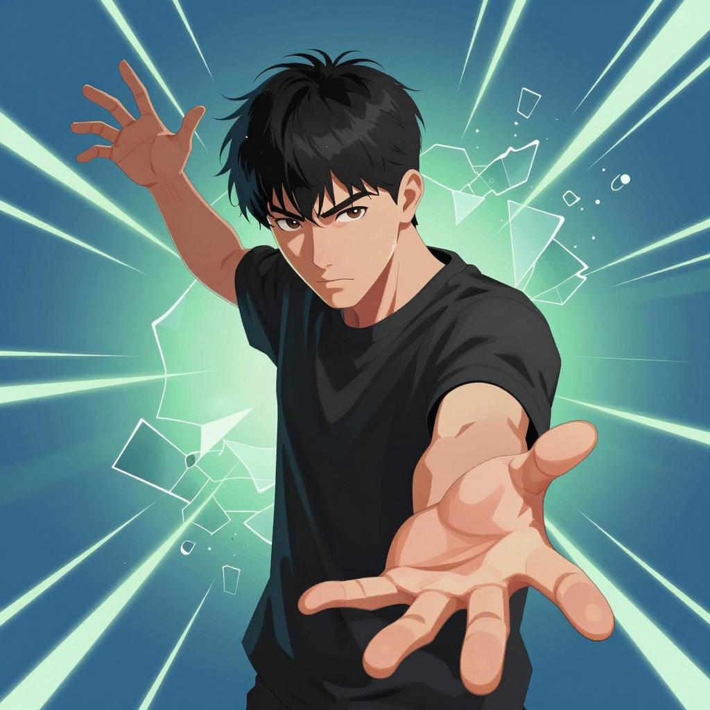 Illustration of a man with short black hair and glasses, wearing a white shirt and black jacket, looking up at six blood-covered, grotesque hands with clenched fingers and exposed teeth. Large, sinister face with a wide grin and bald head in the top right corner. Black background. Six hands in a semi-circle around the man's head.