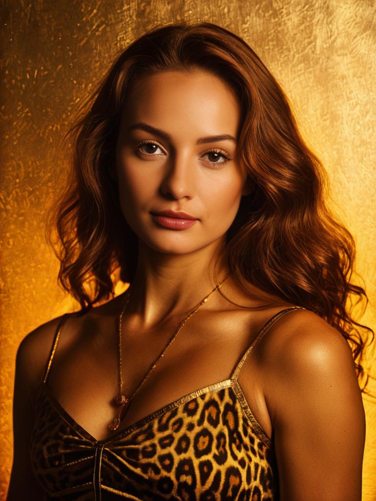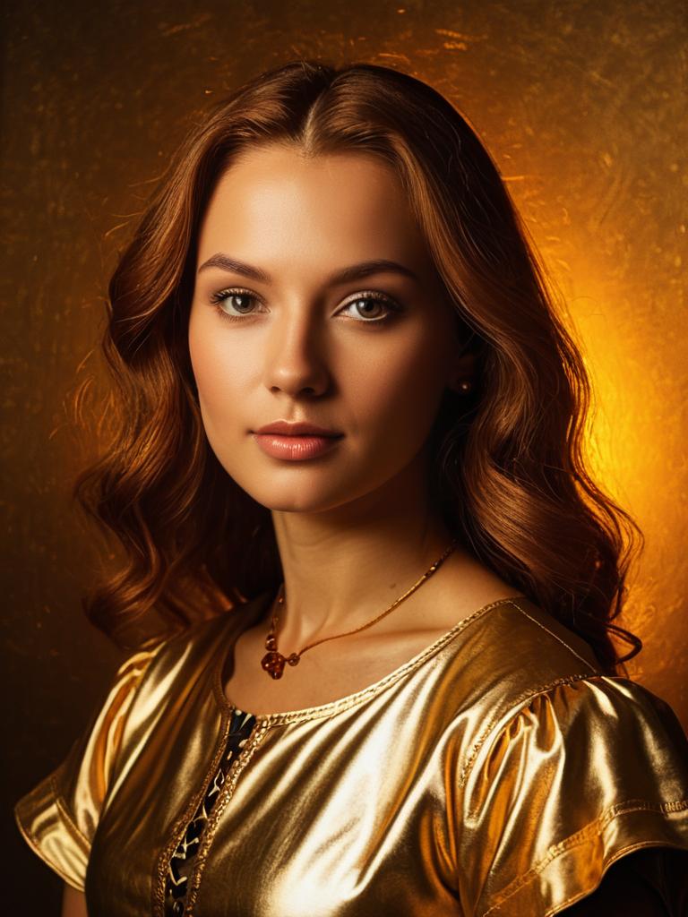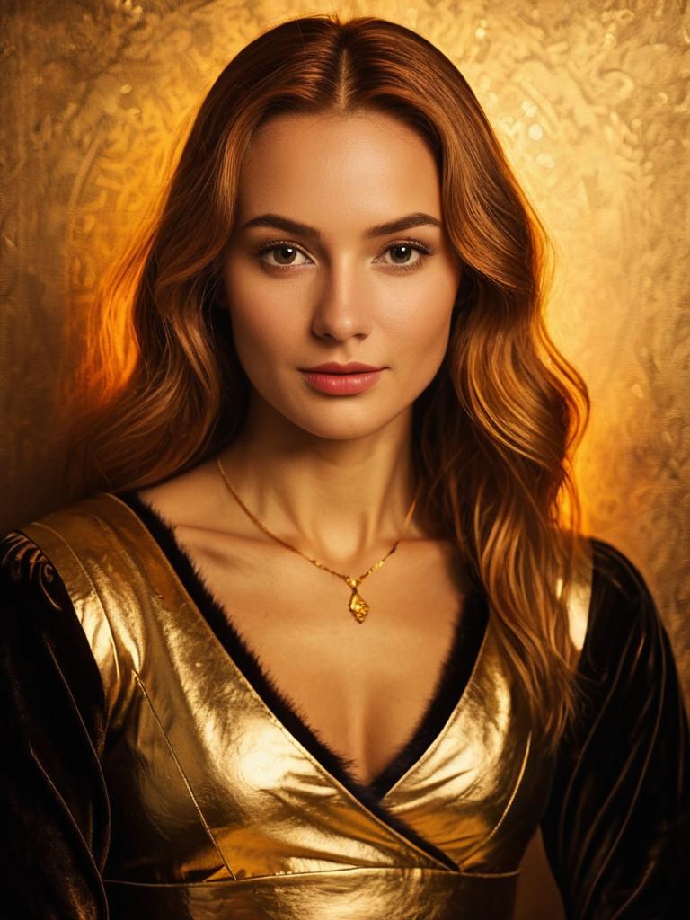 Portrait of a young woman with light skin and long auburn hair wearing a metallic gold ruched tube top with thin straps. The photo features a warm, textured golden background, highlighting her smooth, glowing skin and natural makeup. The woman gazes softly at the camera with a calm expression.