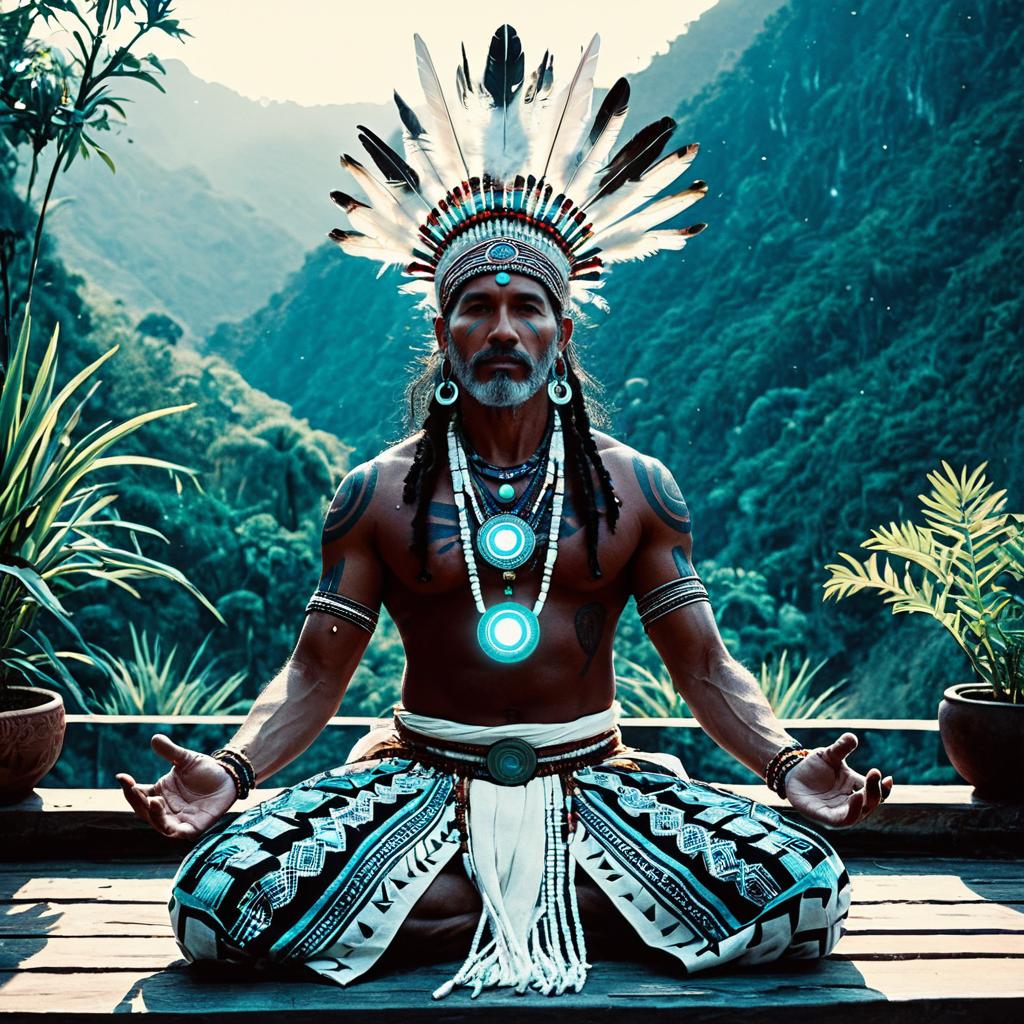 A beautiful male shaman in tribal attire meditating in the Terras Indígenas, experiencing a powerful Kundalini awakening. The setting reflects Kaiowá Hyper-Cyber Shamanism, blending traditional indigenous elements with futuristic, cyberpunk-inspired designs. The man is surrounded by glowing, ethereal energy, representing the awakening of his Kundalini. His attire is rich with intricate patterns, feathers, beads, and other natural elements, while neon accents and technological details intertwine with the natural surroundings. The background features the lush landscape of the Terras Indígenas, with vibrant flora and futuristic elements woven into the scenery. The atmosphere is serene yet powerful, blending spiritual awakening with a unique futuristic tribal aesthetic