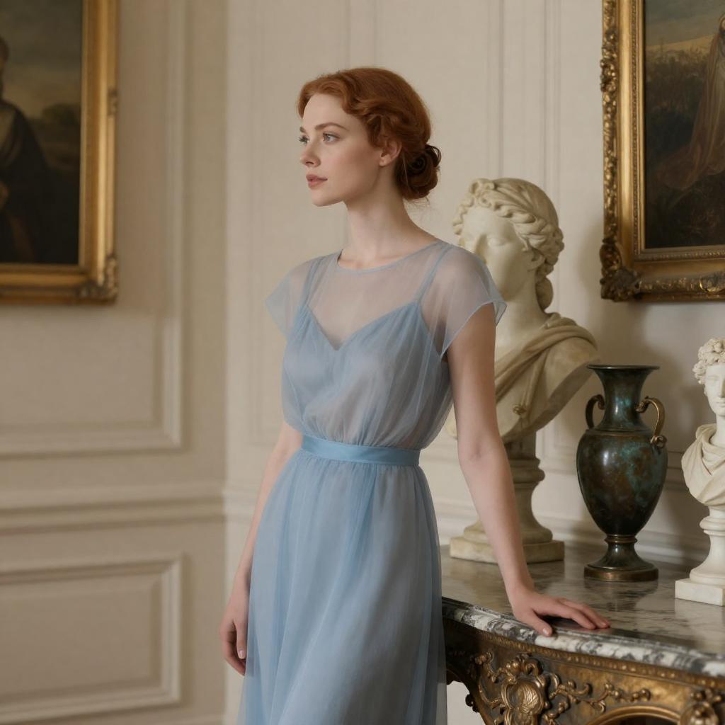 Photograph of a woman in a sheer, light blue dress standing beside an ornate table. She has fair skin, red hair in an updo, and a side profile. To her right, a classical stone bust and a dark bronze vase. Background features elegant, cream-colored paneled walls with framed artwork. The woman's expression is calm and focused.