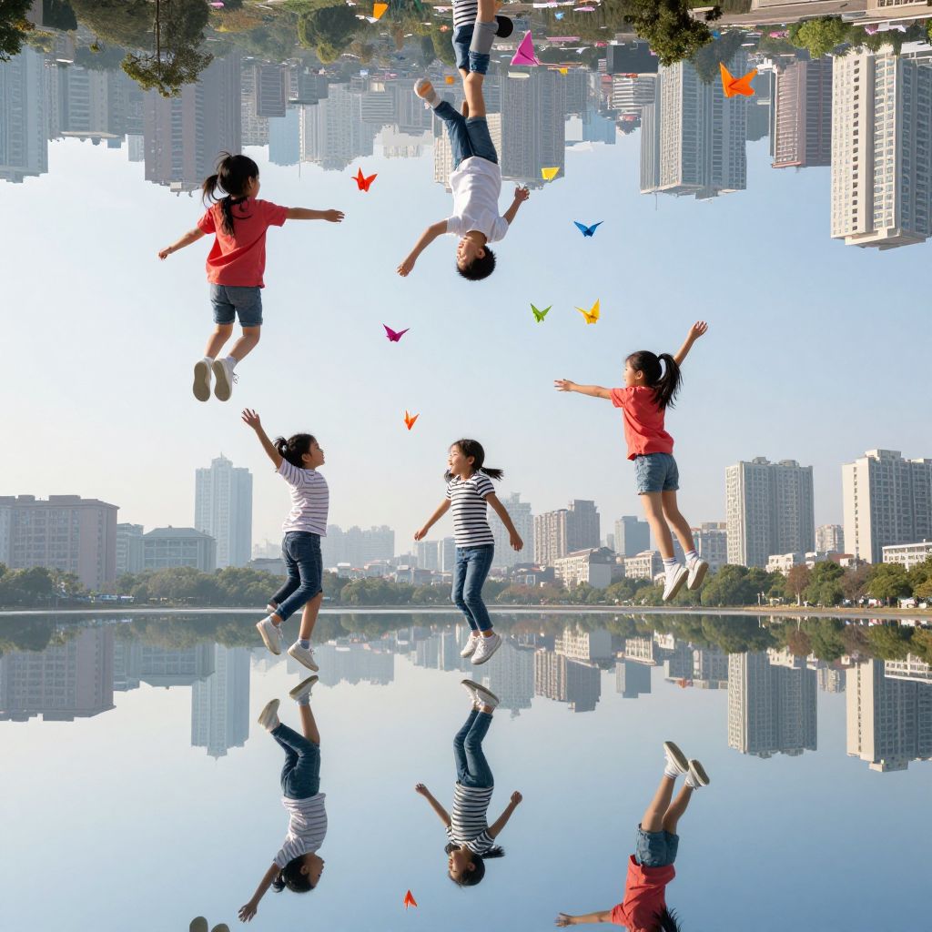 Suspended between dream and reality, children soar on vibrant paper cranes through an inverted cityscape, their laughter echoing like whispers of freedom above a mirrored lake that reflects the weightless joy of escape.