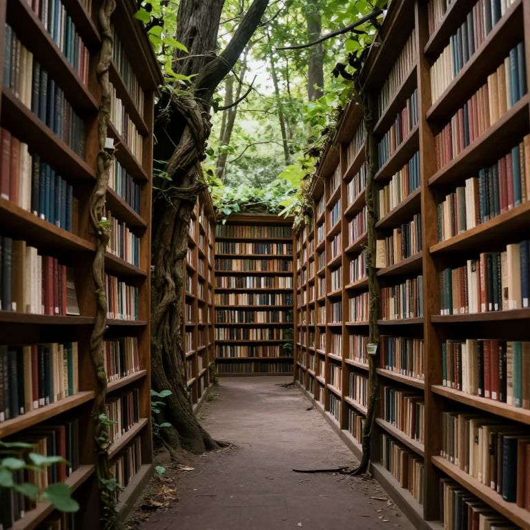 A serene forest path transforms into an endless aisle of bookshelves, where ancient trees intertwine with wooden shelves brimming with volumes, creating a mystical library where nature and knowledge merge seamlessly.