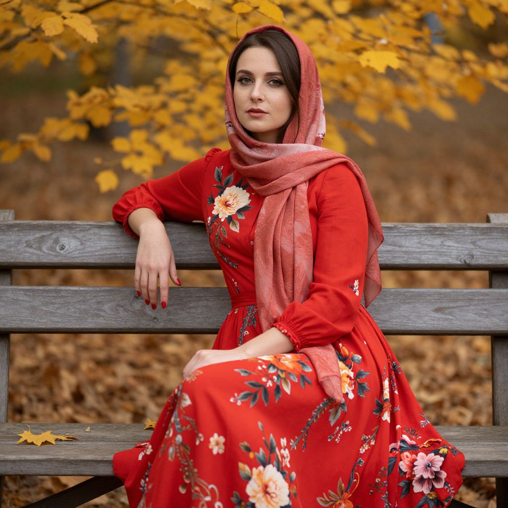 Photograph of a fair-skinned woman with dark hair, wearing a red dress and headscarf, sitting on a wooden bench in an autumn forest
