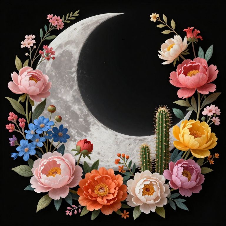 The image presents a captivating floral moon art, where a crescent moon occupies the central space, surrounded by an array of vibrant flowers and foliage. The moon, with its detailed surface texture, serves as a striking backdrop against the dark background. The flowers, in a variety of colors including soft pinks, rich oranges, cool blues, and warm yellows, are meticulously arranged, creating a harmonious balance. Some flowers, such as the large, delicate peonies and the intricate, spiky cacti, are positioned closer to the moon, while others, like the smaller, clustered blooms, are situated further away, adding depth to the composition. The leaves and stems, with their varied textures and shapes, interweave throughout the scene, enhancing the naturalistic feel. The overall arrangement is symmetrical, with the flowers and foliage evenly distributed around the moon, creating a sense of unity and tranquility. The interplay of colors and textures, combined with the precise placement of each element, results in a visually stunning and balanced artwork.