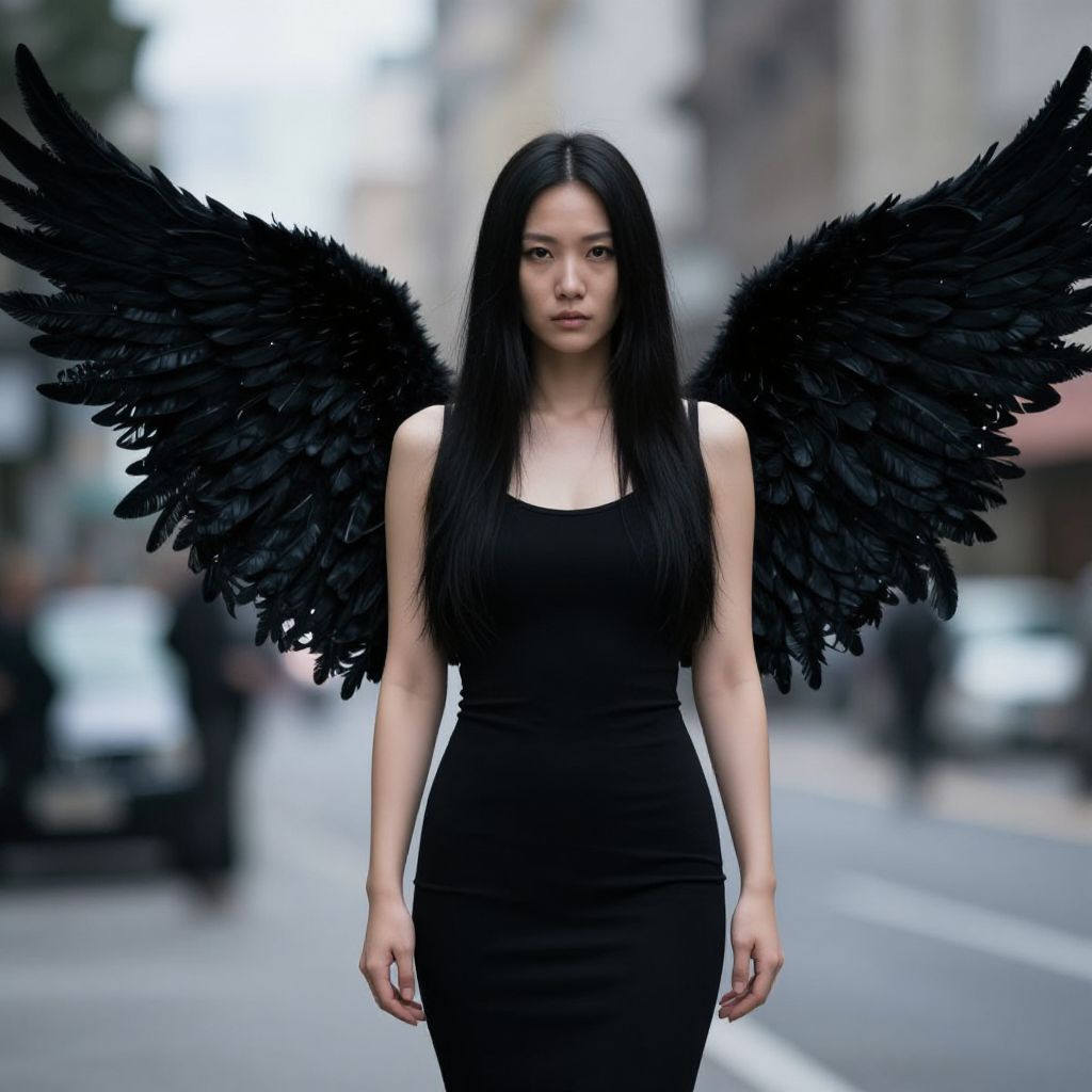 Photograph of an Asian woman with long black hair, wearing a tight black sleeveless dress and black feathered wings. She stands confidently on a blurred city street, with a serious expression. The wings are large and textured, contrasting with her smooth, pale skin. The background is out of focus, featuring indistinct buildings and a car. The overall vibe is dark and mysterious.